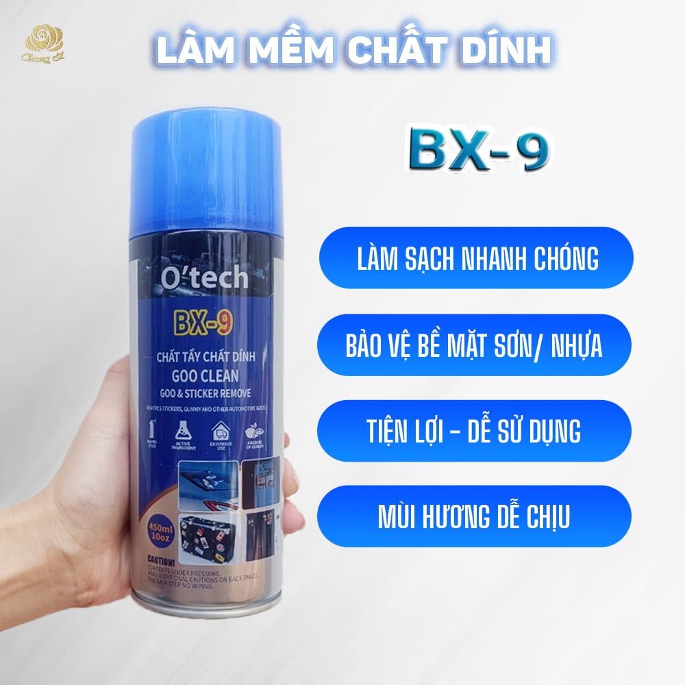 BX-9 Chất tẩy chất dính là loại chất tẩy có dung môi và thâm nhập trên bề mặt. Nó là chất lỏng trong suốt màu vàng nhạt với hương thơm cam nhẹ. Nó có thể làm rách các nhãn dán trên cửa sổ ô tô hoặc bề mặt sơn, bề mặt đá cẩm thạch,… và cũng có thể dễ dàng loại bỏ chất dính còn lại sau khi nhãn dán bị xé ra. BX-9 thích hợp cho các bề mặt dán như ô tô, kính, biển quảng cáo,… và còn xử lý như các giấy dán trên thân ô tô, kính chắn gió, biển quảng cáo, cột điện,…
